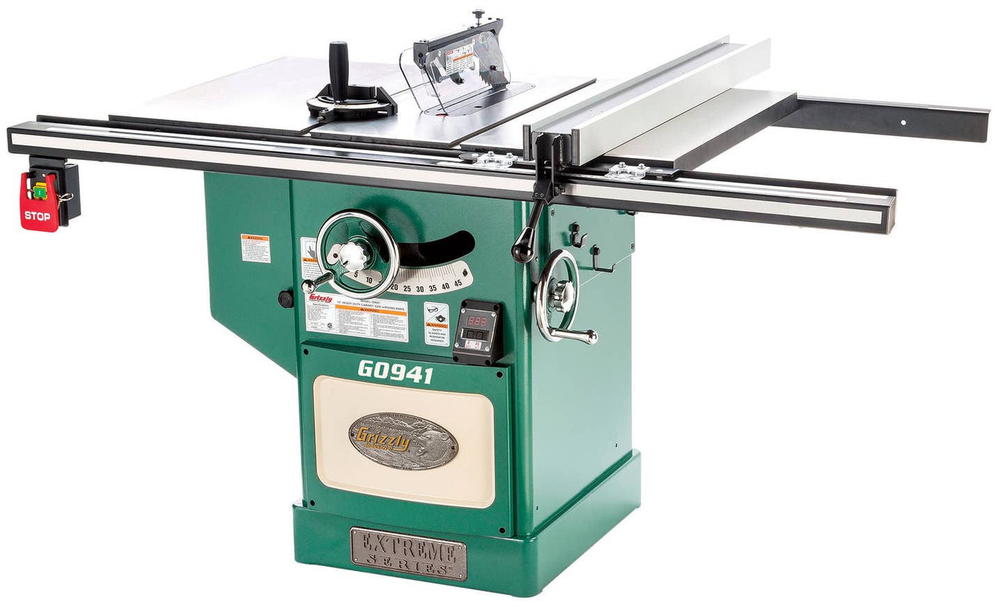 Grizzly Industrial has introduced its largest 10” free-standing cabinet saw without extension rails, model G0941, featuring a rip width of 36” to the right of the blade, 18” to the left, and a maximum cut depth of 3-3/16”.